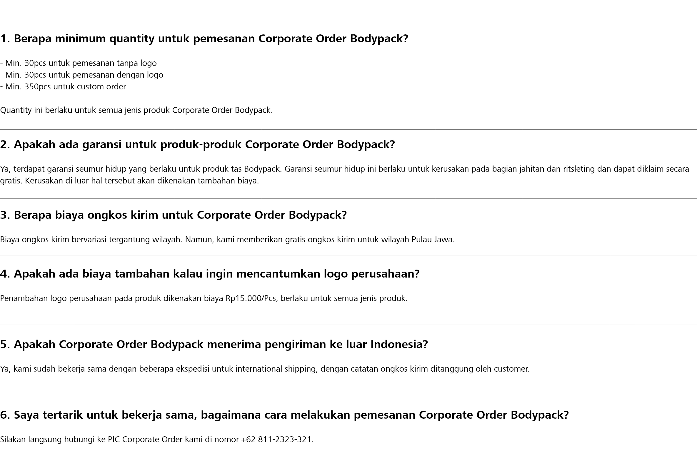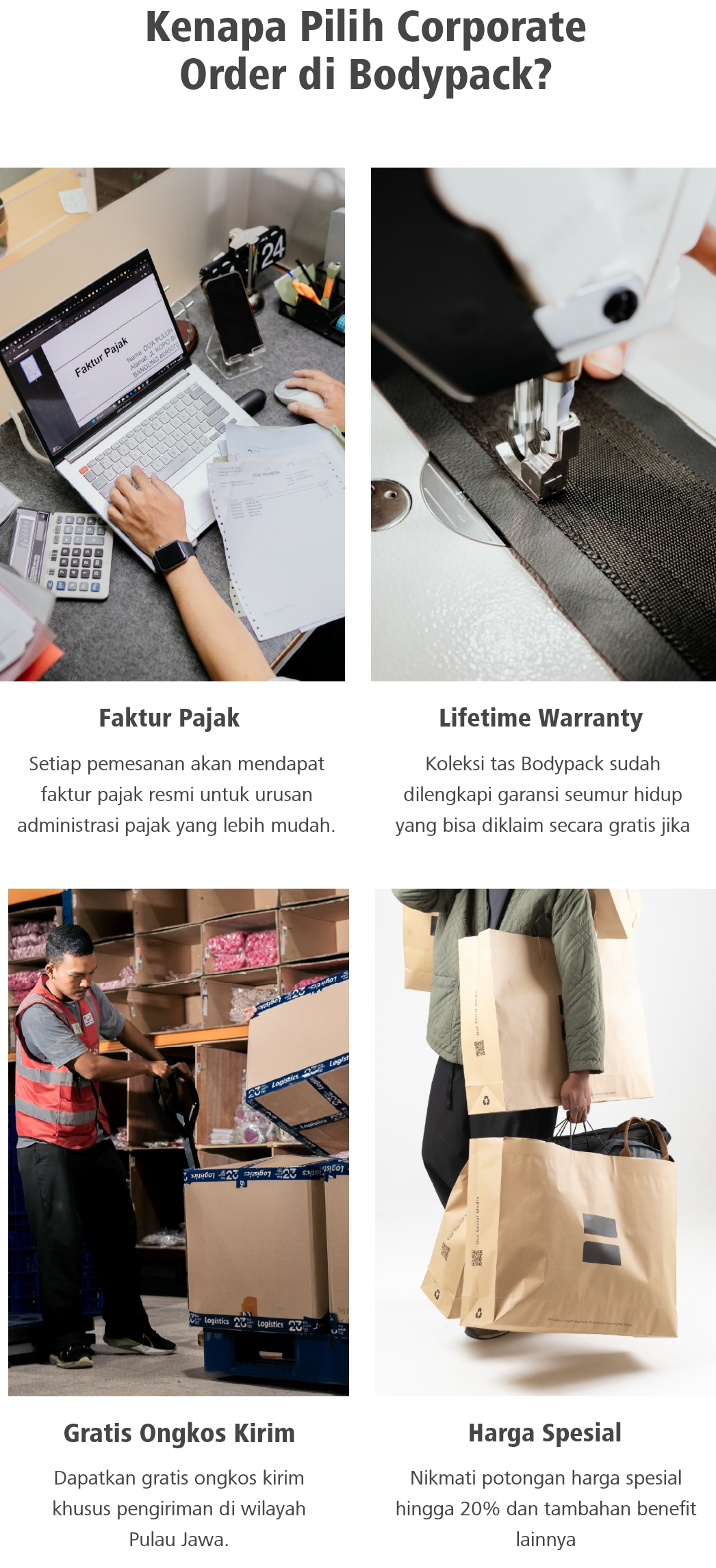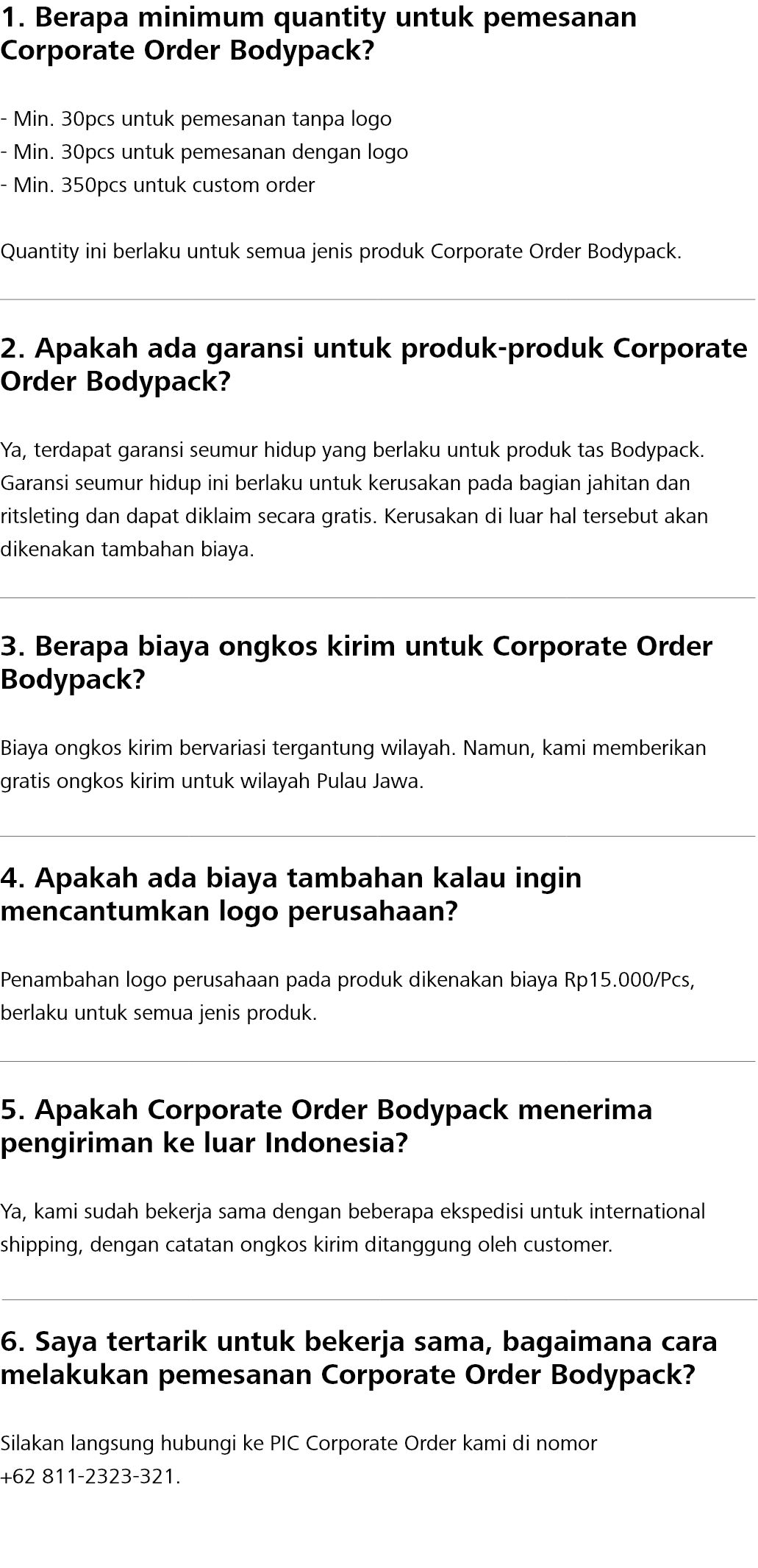 Dapatkan kemudahan untuk pemesanan produk Bodypack dalam jumlah besar, lengkap dengan penambahan logo perusahaan atau desain khusus sesuai kebutuhan.