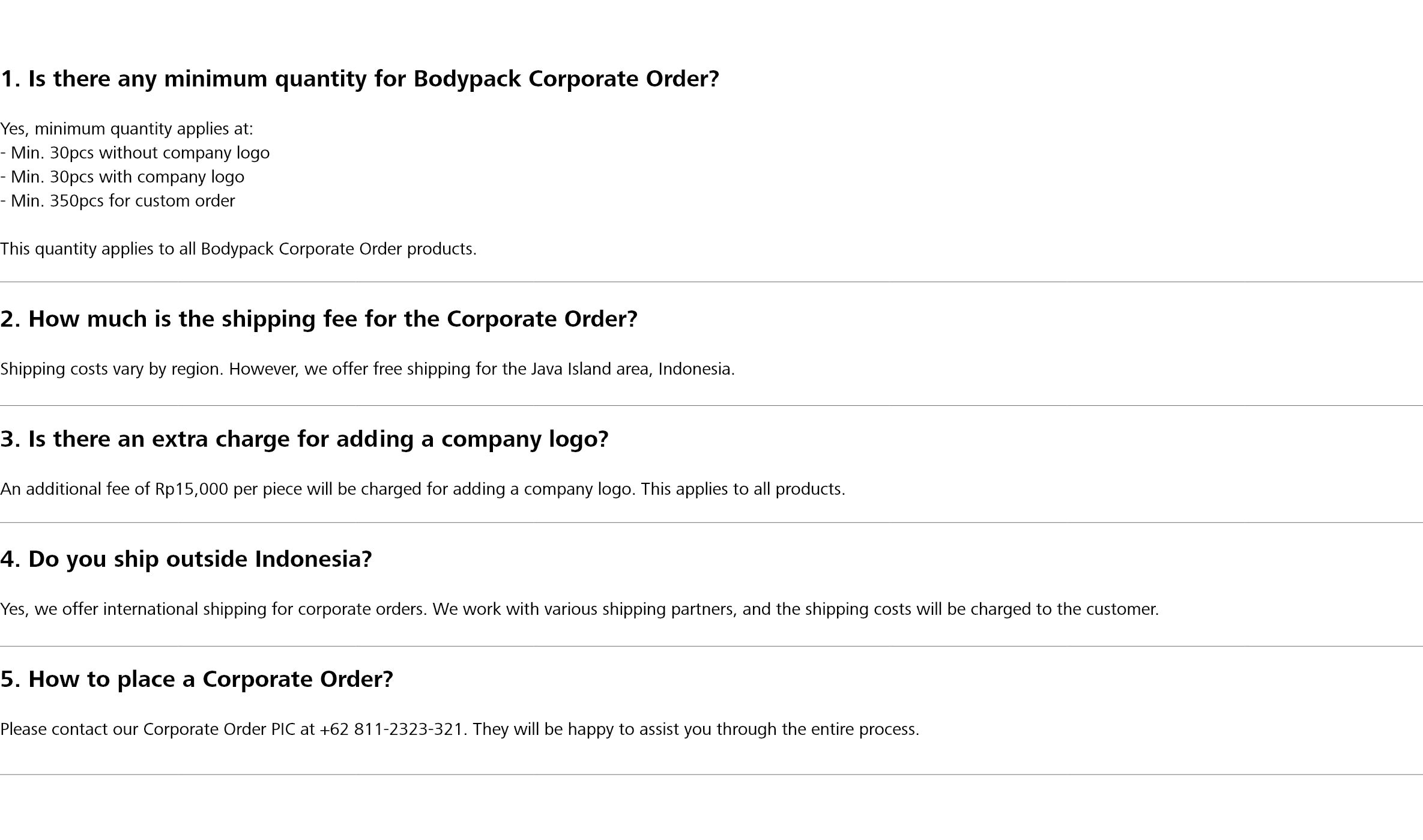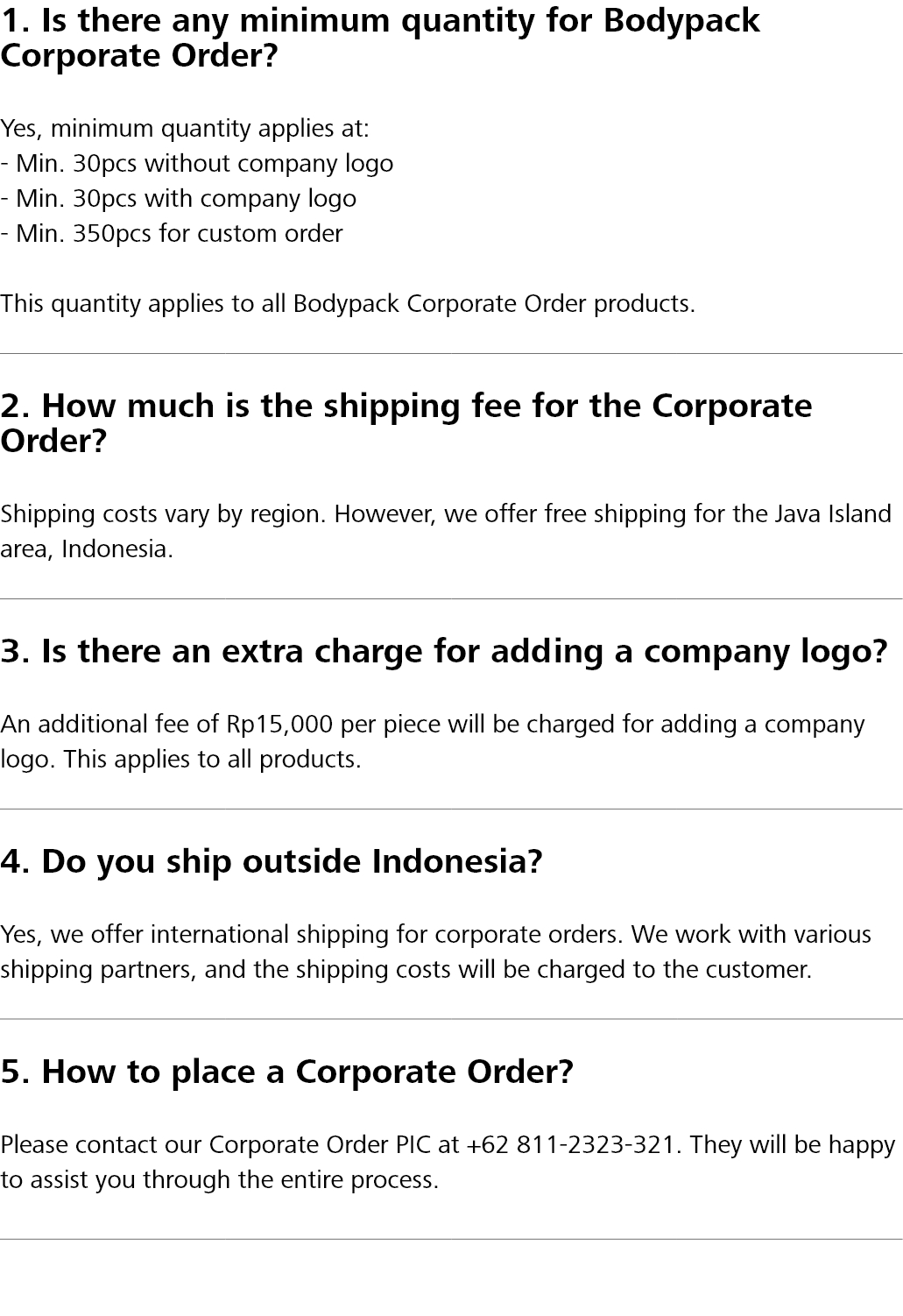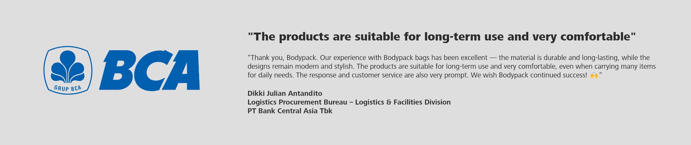 Enjoy hassle-free bulk orders with Bodypack, with custom logos or designs tailored to your needs. Locally crafted in Indonesia, make a lasting impression with our collection for years to come.